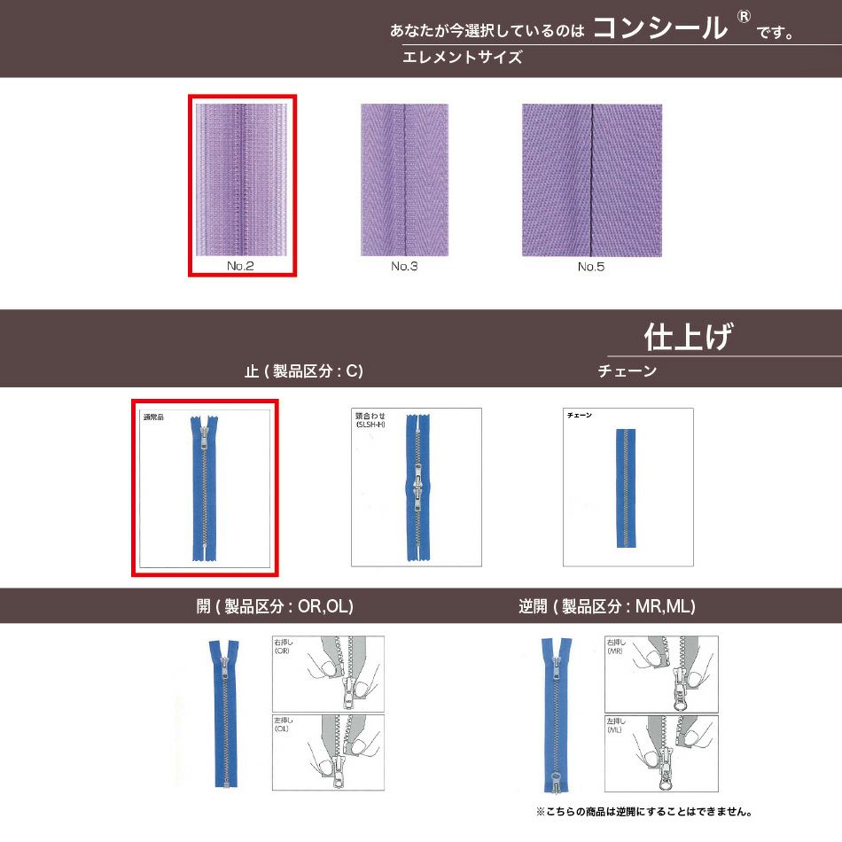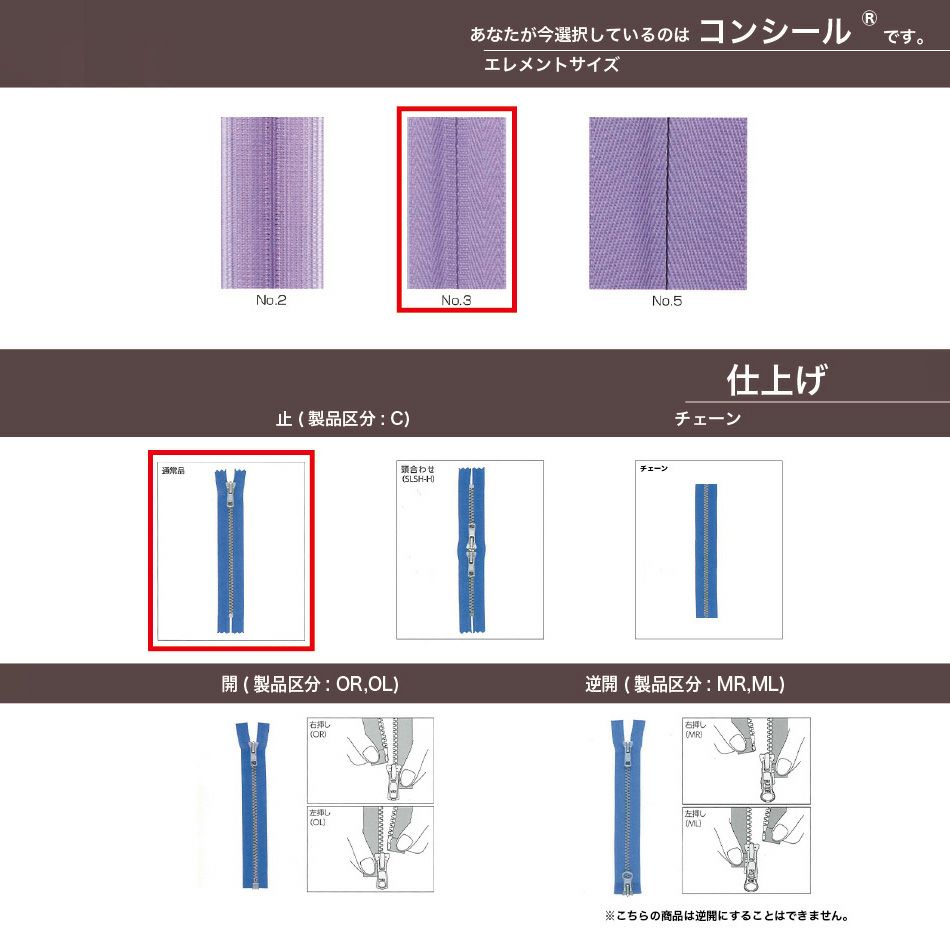 縫い目、エレメントが表地にでないファスナーです。ワンピースなどファスナーを目立たせたくない用途に適しております。