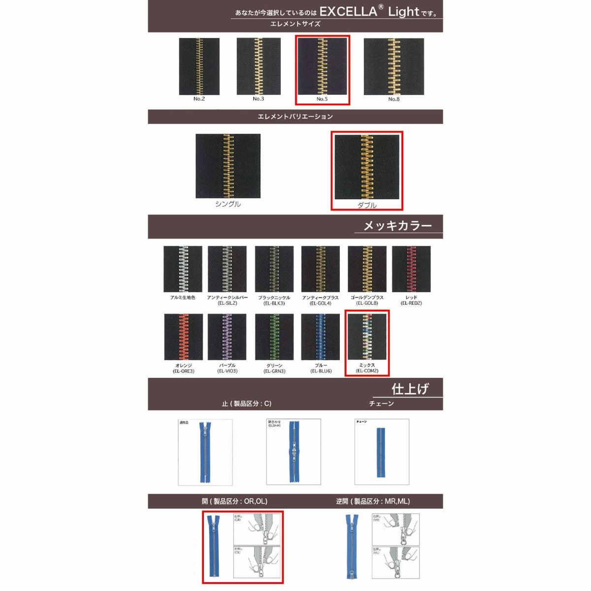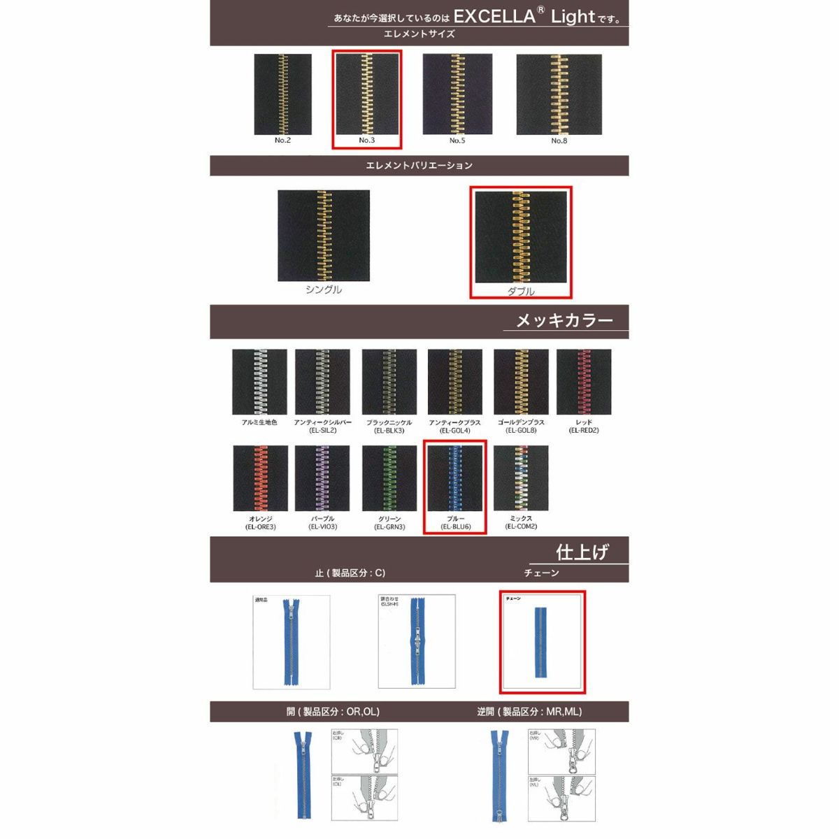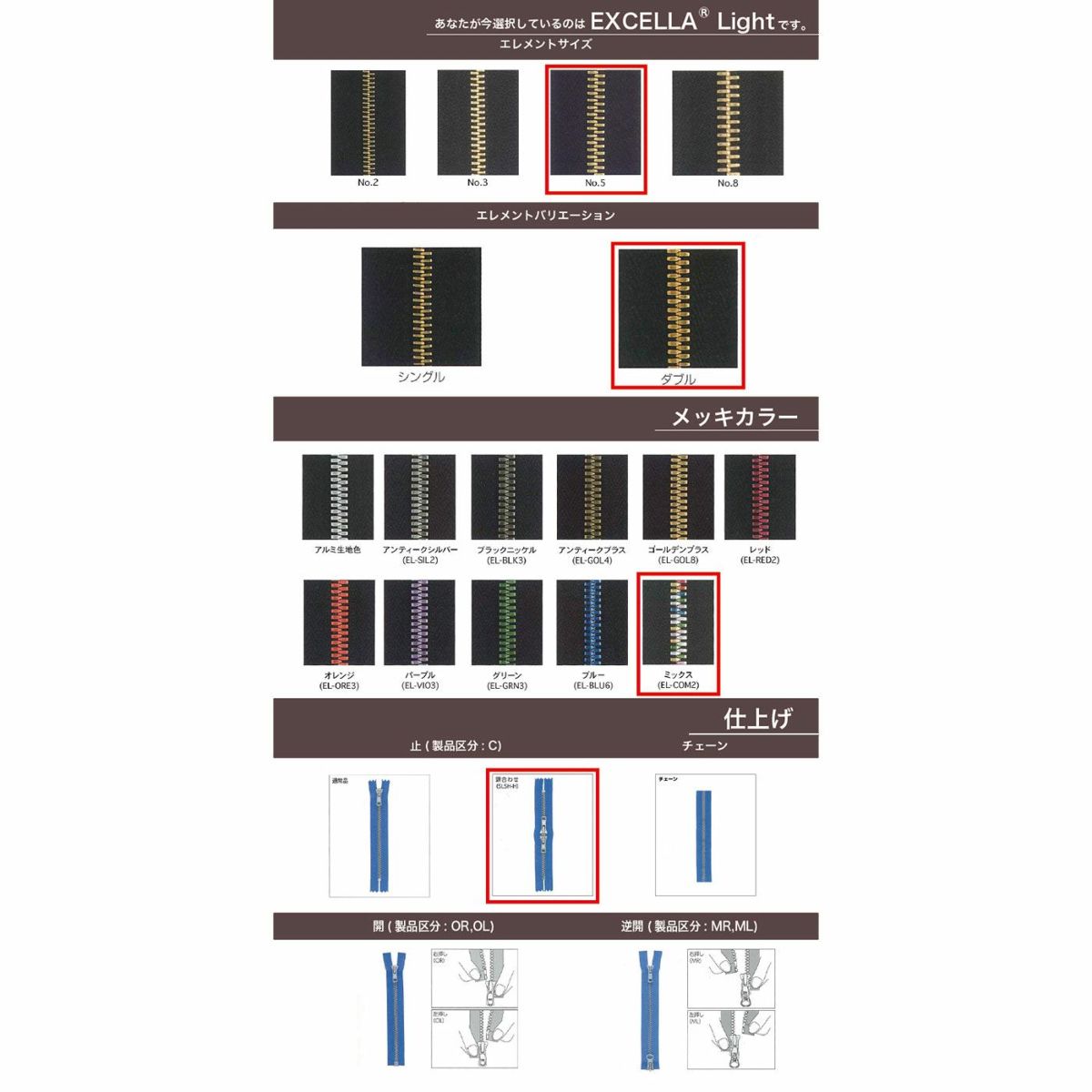 EXCELLA®同様エレメント1つ1つを入念に磨きをかけた高級ファスナーです。アルミ合金を使用することで軽量化されたことと豊富なカラーバリエーションが特徴です。